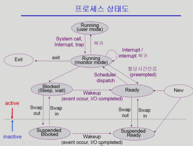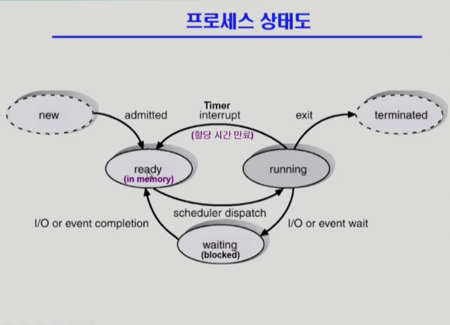 인터럽트 : 인터럽트 당한 시점의 레지스터와 program counter를 save한 후 CPU의 제어를 인터럽트 처리 루틴에 넘긴다.