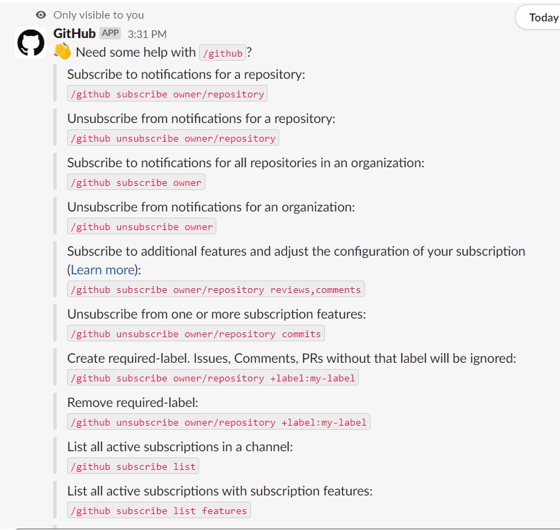 채팅방에 /github help를 치면 여러가지명령어에 대한 설명이 나온다.