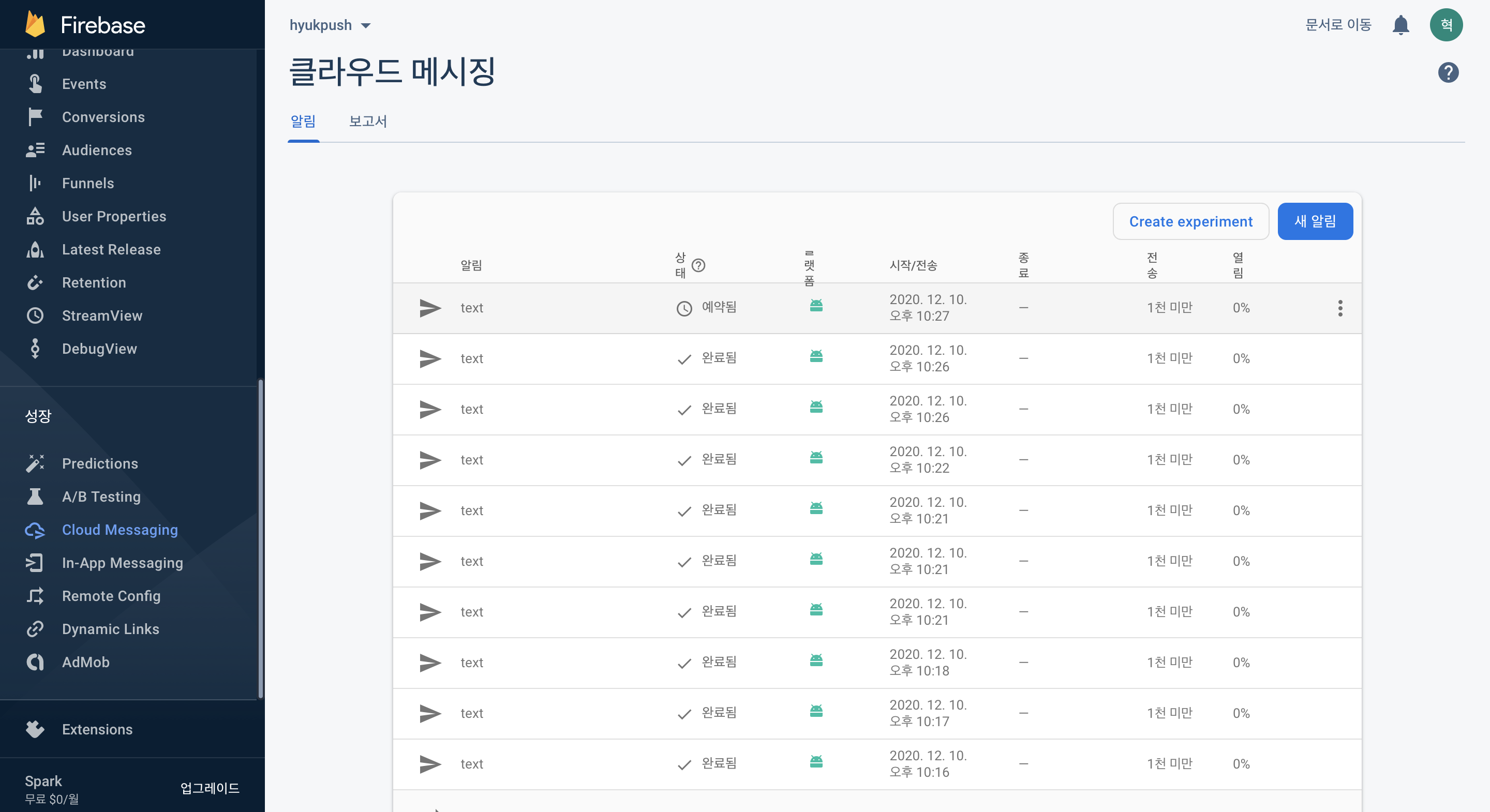 좌측에 성장 > Cloud Messagin을 누르면 위와 같은 페이지가 나온다.