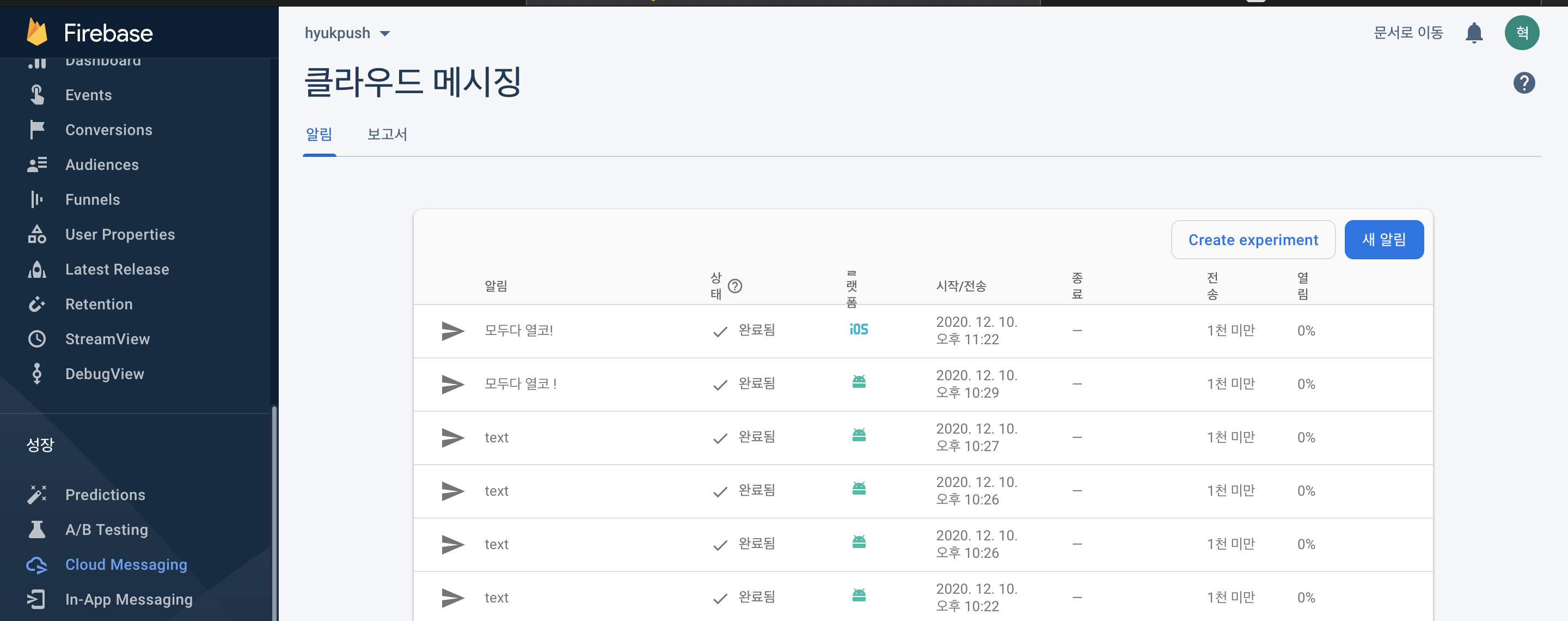 좌측 하단에 성장 > Cloud Messaging에 들어가서 새알림을 보내준다.