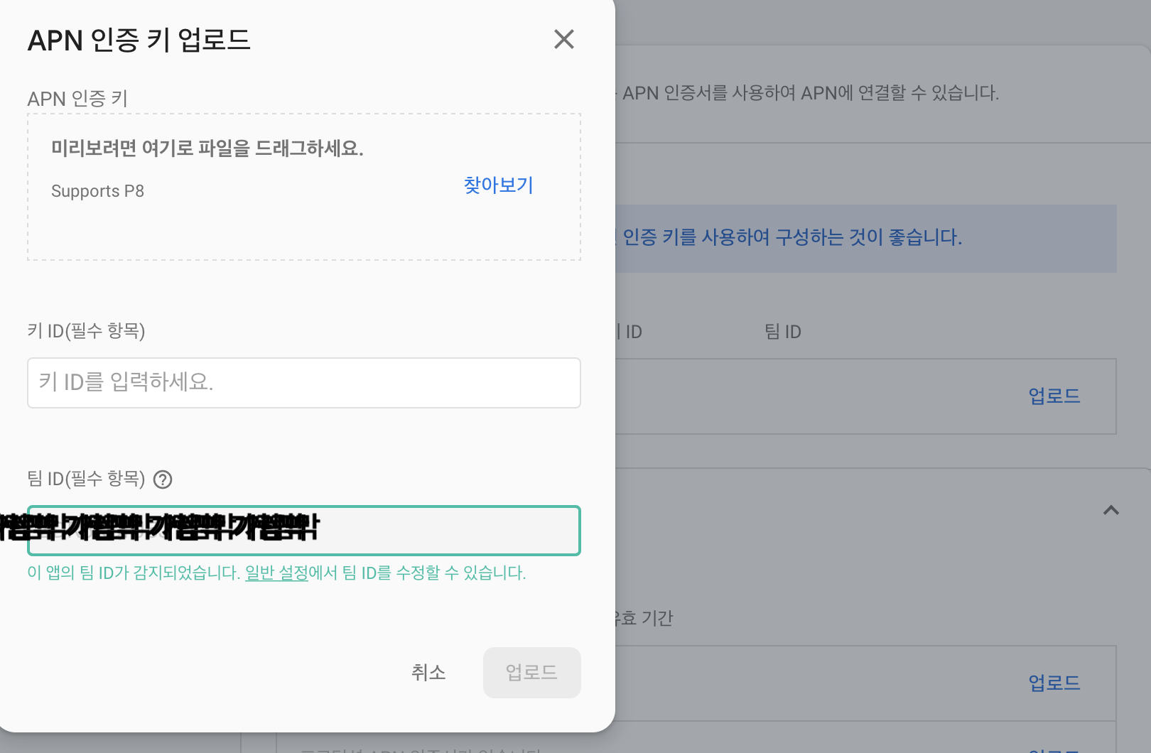 다운 받은 Apple Key와 Key ID, 팀 ID를 입력해서 업로드 해준다.