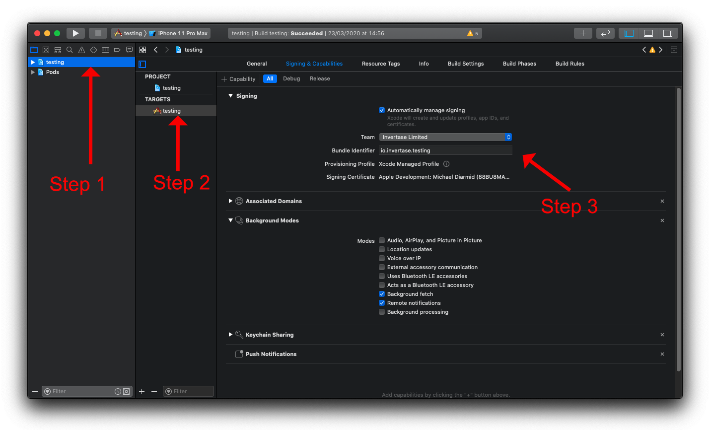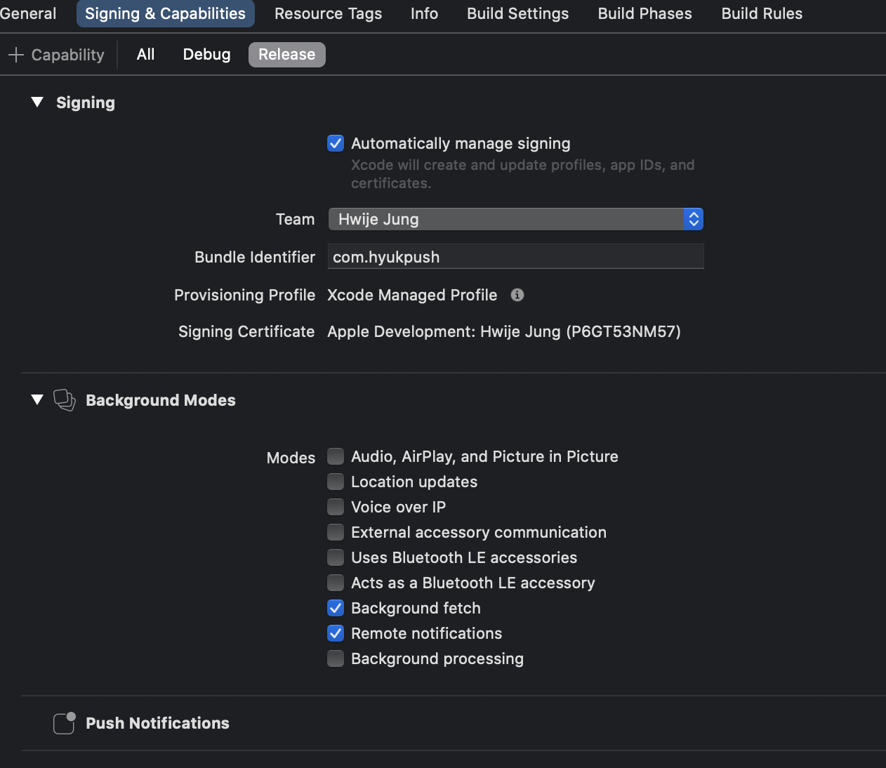 'Background Modes'에 'Background fetch', 'Remote notifications'를 체크해주자.