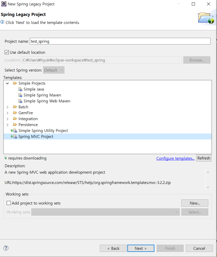 프로젝트 이름을 입력하고 Spring MVCProject를 선택한다.