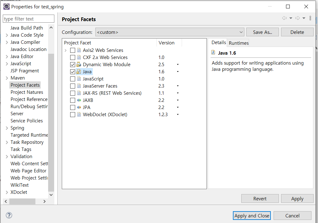 Maven > Project Facets > Java를 클릭후에 Apply and Close를 누른다 (Java 버전에 맞춰 변경)