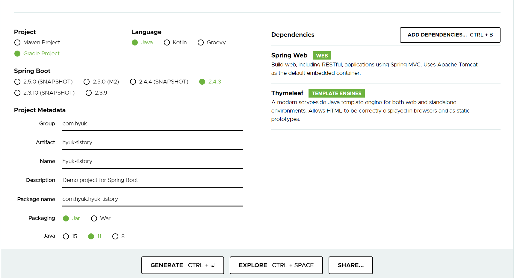 1. start.spring.io/ 사이트에 접속하여 아래와 같이 세팅(2021.03.06기준)