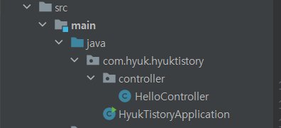 2) src > main > java > com.hyuk.hyuktistory에 controller라는 패키지 생성 후 HelloController클래스 생성
